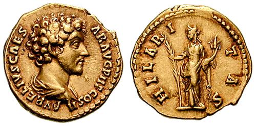 Marcus Aurelius, as Caesar, gold Aureus. 145 AD. AVRELIVS CAESAR AVG PII FIL COS II, bare-headed & draped bust right / HILARITAS, Hilaritas standing facing, head left, holding palm & cornucopiae