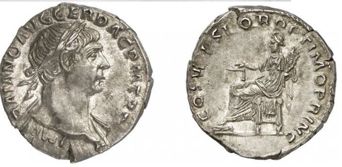 Trajan silver Denarius. IMP TRAIANO AVG GER DAC P M TR P, laureate bust right, draped far shoulder / COS V P P SPQR OPTIMO PRINC, Aequitas seated left holding cornucopiae & scales