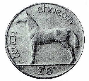 The half-crown (2s6d or 2/6) coin was a subdivision of the pre-decimal Irish pound, worth 1/8 of a pound. The halfcrown was commonly called “two and six” due to its value of two shillings and sixpence (indicated on the coin itself as ‘2s6d’). For almost half a century it was the largest circulating Irish coin – the 10/- piece of 1966 didn’t really circulate because the people at the time didn’t take to it – often complaining “haven’t we got a 10/- note.” The 10/- coin was quickly withdrawn when the price of bullion silver rose rapidly and the coin’s face value was less than its bullion value.