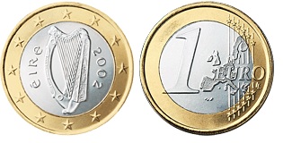 The one euro coin (€1) is the new basic unit of currency for the Euro Zone – an area where a common currency (the Euro) is used. This new economic area was implemented on 1st January 2002 when 12 national currencies of varying values were replaced with new coinage and banknotes. The rates of exchange were fixed in 1999 and citizens had a short period of dual currencies to get rid of their old money, i.e. you could pay for your goods/services in either the new currency or the old, but you always got your ‘change’ in the new currency.