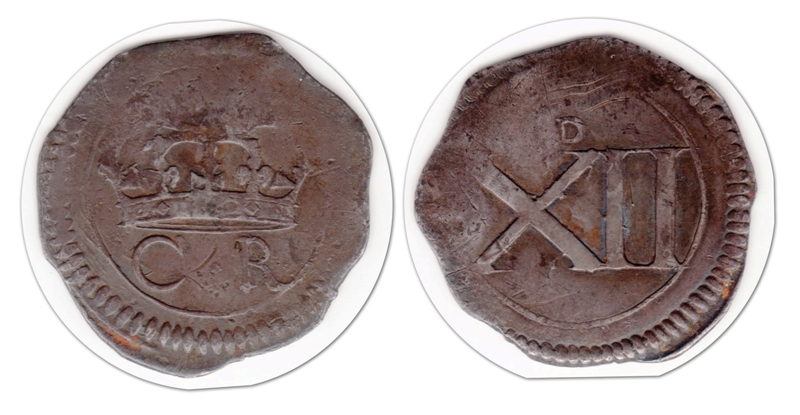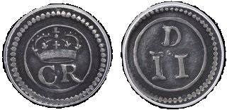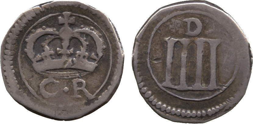- obv. crowned C R (for Charles Rex) in double circle,