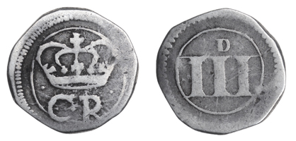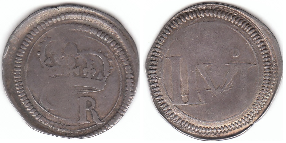 These coins were almost exclusively made from silver plate, cut and struck into a number of denominations with simple patterns including their value in ‘old style’ Roman numerals, where ‘4’ is written as ‘IIII’ and not the modern style ‘IV’ as seen on many modern coins. Sometimes, on particularly well-preserved examples, one can see the original patterns on the silver plate, and, very occasionally, a contemporary hallmark from the Dublin Silversmith’s Guild.