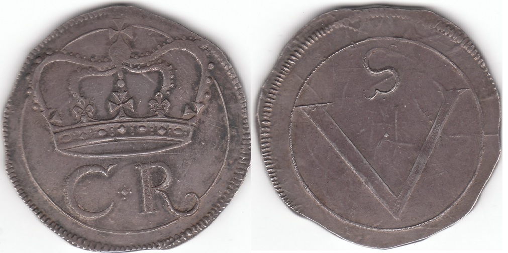 - rev. large V below smaller S (denoting 5 shillings) within double circle