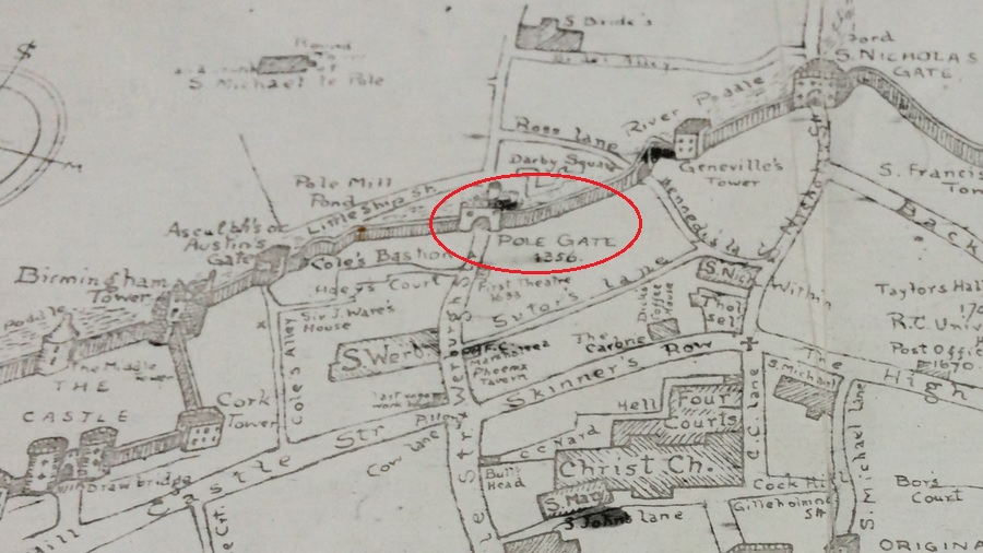 This is a map constructed by an historian – Leonard Strangeway’s 1904 The Walls of Dublin. It depicts the medieval city and walls, but it was made much later. Unlike most maps, Strangeways’ map is “the other way round” so please bear in mind here that South is “up” and North is “down”. The walls and fortifications around Dublin were first in the 9th C but the defences of Dublin eventually fell into disrepair – although they continued to serve a purpose as late as 1762. In that year, an auction took place – selling the rights to collect tolls at each of the (then) seven city gates. This auction raised £4,000 for the city. St Werburgh’s Gate (at that time) was also known as Le Pole Gate) and this is where Bollardt’s plot of waste land was located – somewhere near the intersection of modern day Little Ship Street and Werburgh Street.