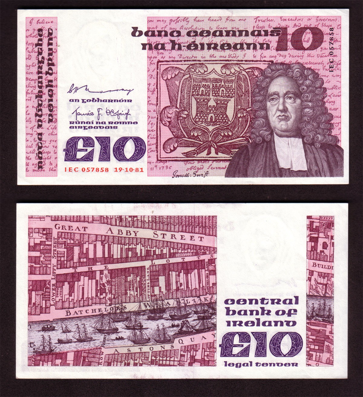 - Obverse: The predominantly purple-coloured ten pounds had a portrait of Dean Jonathan Swift the poet and satirist. The background contains a reproduction of the coat of arms of Dublin from a city council resolution against a letter by Swift from April 1735.