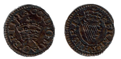 Strictly speaking, the Harington ‘patent’ Farthings are not part of the Irish coinage of James I but, since many turn up in Ireland (either as genuine finds, or as imports by collectors or dealers), they cause a lot of confusion due to their having a harp on the reverse. Also, this patent was carried through by no less than four subsequent patentees – the second, third and fourth of which did produce farthings ‘authorised’ for use in Ireland upon continuation of the original patent first granted to Lord & Lady Harington.