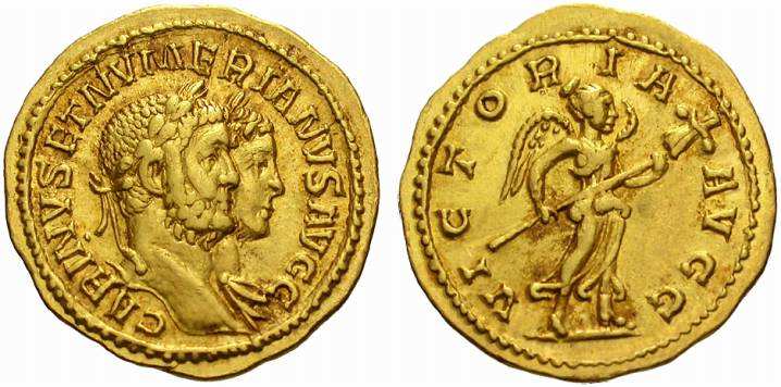 Carinus amd Numerian, AV aureus. 21 mm. 4.66 gr. Lyons. CARINVS ET NUMERIANVS AVGG, Jugate busts of Carinus, laureate, and Numerian, laureate and draped, right / VICTORIA AVGG, Victory walking left, holding trophy. Calicò 4405a; Cohen 4 var (denarius); Bastien, Lyons, 405 var (denarius)