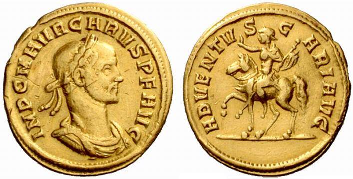 Carus, gold aureus, Ticinum, 282-283 AD. 4.21 gr. IMP C M AVR CARVS P F AVG, laureate, cuirassed bust right / ADVENTVS CARI AVG, Carus on horseback packing left, holding sceptre and raising right hand. Cohen 6 var (spear); Calicó 4260 and Biaggi 1642