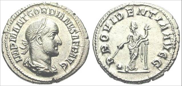 Denarius of Gordian II Africanus (238 CE) minted in Rome. Obverse IMP M ANT GORDIANVS AFR AVG, laureate and draped bust right; reverse PROVIDENTIA AVG