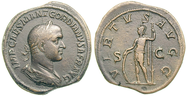 Gordian II Æ Sestertius. IMP CAES M ANT GORDIANS AFR AVG, laureate, draped and cuirassed bust right / VIRTVS AVGG, S C across field, Virtus standing left, holding spear and resting against shield. Cohen 15