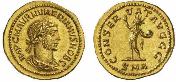 Numerian, gold aureus, Antioch mint, AD 283. IMP C M AVR NVMERIANVS NOB C, laureate, draped, cuirassed bust right / CONSERVAT AVGGG, Sol standing left, holding globe and raising right hand. Mintmark: SMA. RIC 373, Calico 4303; Sear 12209