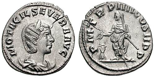 Tranquillina, wife of Gordian III, Augusta, AD 241-244. Silver Denarius minted at Rome. SABINIA TRANQ-VILLINA AVG. Diademed and draped bust of Tranquillina right. Reverse: CONCORDIA AVGG. Concordia (Concord) enthroned left, holding patera and double cornucopiae. RIC 252 (R4); RSC 1a