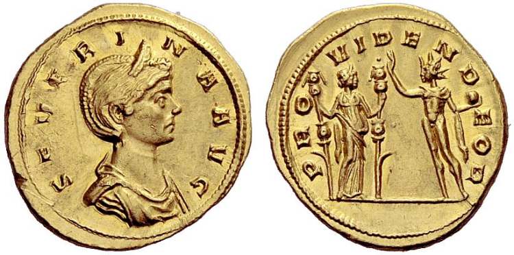 Severina, AV Aureus. Ticinum AD 274-275, 6.39 g. SEVERINA AVG, diademed and draped bust right / PROVIDEN DEOR, Sol standing left, holding globe and raising right hand towards Fides, standing right, holding two standards