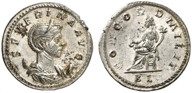 Severina, billon antoninianus, Lyons. SEVERINA AVG, diademed and draped bust right, on crescent / CONCORD MILIT, Concordia seated left, holding patera and cornucopiae. Mintmark BL