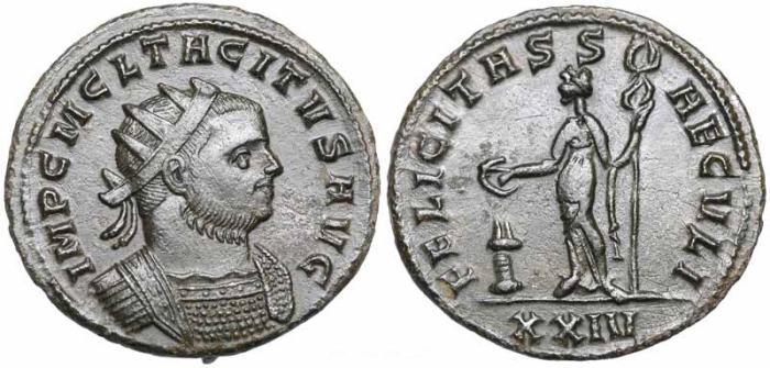 Tacitus AE Antoninianus. Siscia. IMP CM CL TACITVS AVG, radiate, cuirassed bust right / FELICITAS SAECVLI, Felicitas, standing left by altar, holding patera and caduceus. Mintmark XXIV. Estiot 2267, La Venera 1759