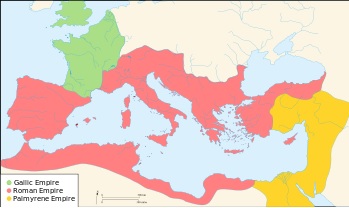 The Roman Empire by 271 A.D before the reconquest of the Palmyrene Empire (orange) and the Gallic Empire (green) by Aurelian