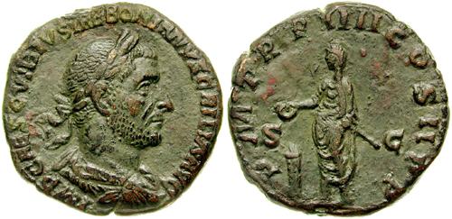 Gordian I Æ Sestertius. IMP CAES M ANT GORDIANVS AFR AVG, laureate, draped & cuirassed bust right, seen from behind / P M T-R P COS P P S-C, Gordian standing left, holding branch in right hand & resting left on parazonium. Cohen 3.
