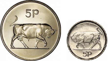 The Irish five pence coin, first introduced in 1971, was 5.65518 grams in weight with a diameter of 2.3595 centimetres. This matched the British five pence coin. As a modern coin it became apparent in the late 1980s that the coin’s physical dimensions were large relative to its value.