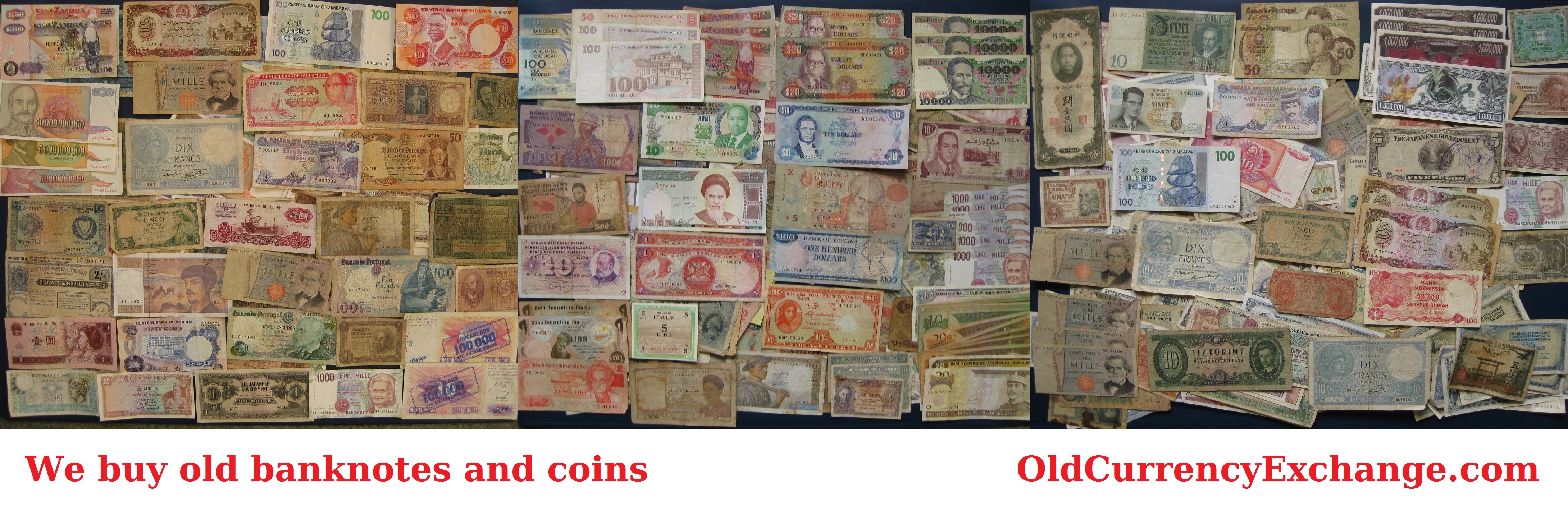 We buy banknotes from all over the world. This includes Irish, British, European and all countries worldwide. We especially like older (vintage) banknotes but will gladly accept your old holiday change, or accumulations in old wallets, junk boxes and attic clearances. Please note, some countries make their banknotes obsolete every 10 years or so, and these banknotes are no longer legal tender for foreign exchange purposes, e.g. Canada and Switzerland change their banknotes regularly to prevent counterfeiting and tax evasion.